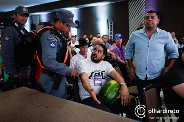 Um manifestante solitário realizou um protesto na tarde deste sábado (17) no ato do Partido Social Liberal (PSL) em Cuiabá. Com uma melancia nas mãos, ele reclamou do abandono da agricultura familiar.