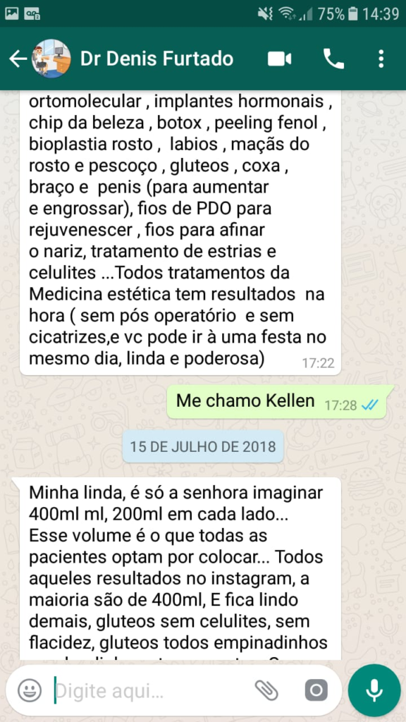 A conversa era tentadora. Em mensagens de WhatsApp, Renata, secretária de Denis, explica a Kellen que não havia complicações ou necessidade de repouso no pós-cirúrgico. “Será vida normal de imediato. Poderá andar, dirigir e até mesmo ir para festas”.
