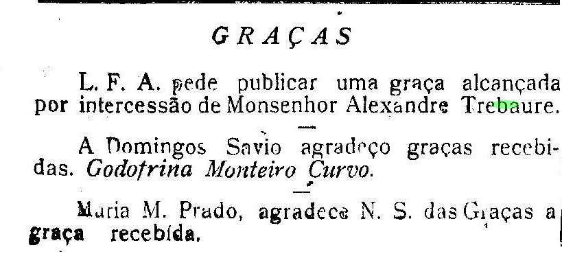 Maria, Ilga, Amália e Thalita foram apenas algumas das pessoas que receberam graças pela intercessão do padre Monsenhor Alexandre Trebaure, morto em 1939. Após alcançarem a benção, oficializaram o testemunho no Jornal A Cruz, uma publicação da sociedade católica da época.