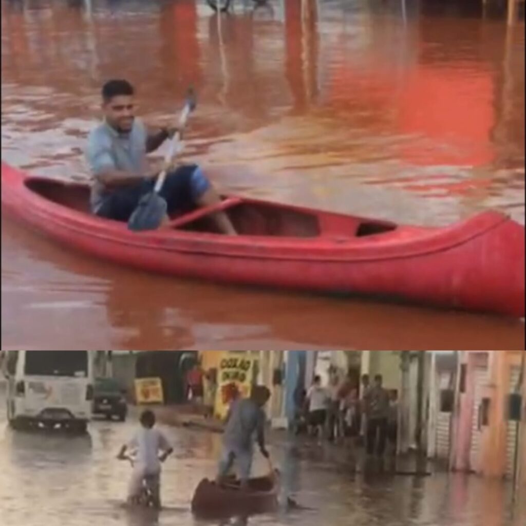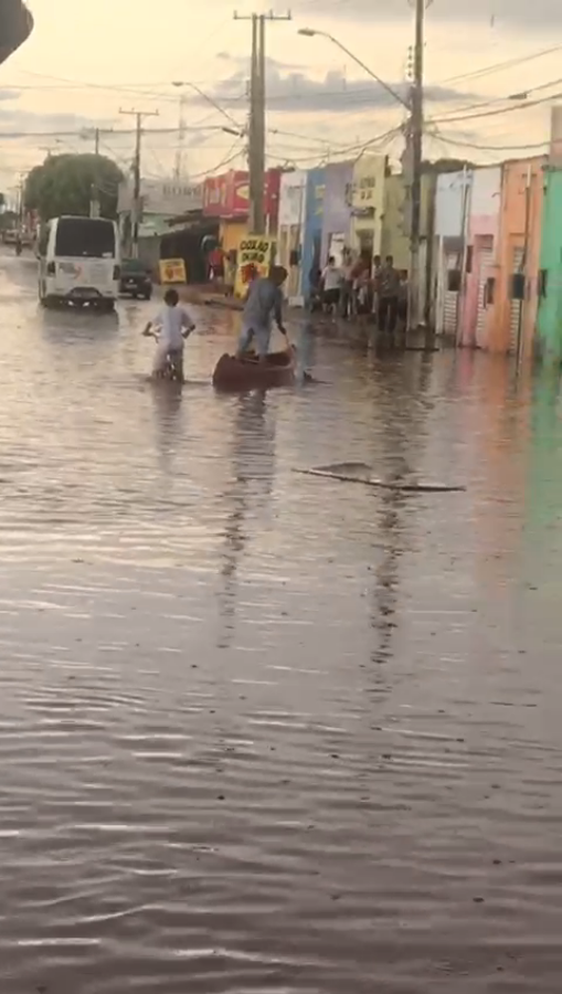 Alguns moradores do Bairro Jardim Industriário, em Cuiabá, aproveitaram o alagamento causado pela chuva, no fim da tarde desta sexta-feira (25), para fazer um passeio de caiaque. Embora a situação seja cômica, o problema é sério.