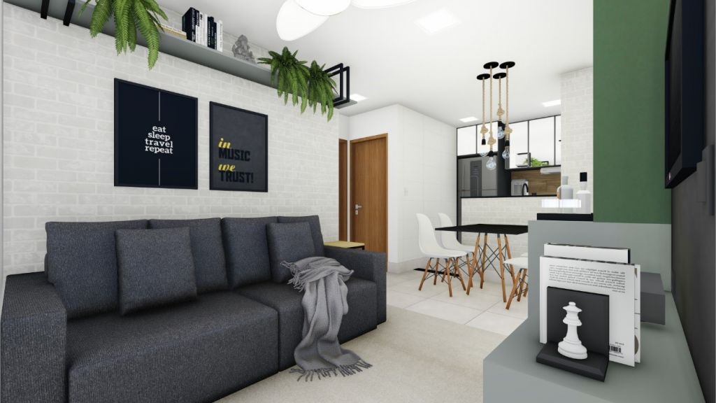 Na sala, podemos ter estantes, prateleiras e até mesmo sofás podem ter o suporte do metalon – e fica lindo demais!
