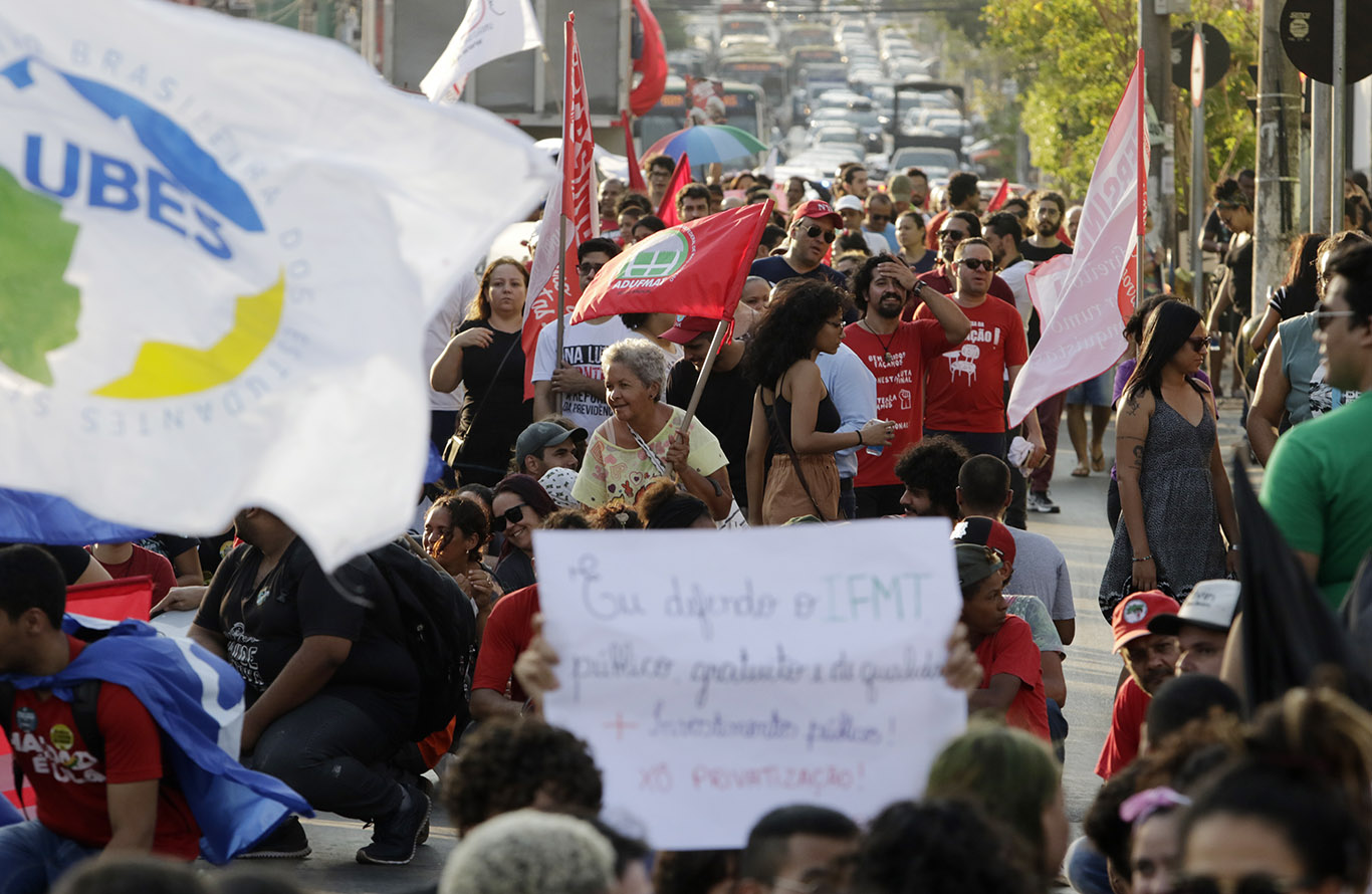 Manifestantes se reuniram na Praça Alencastro, em Cuiabá. Eles se somam a milhares de pessoas de mais de 170 cidades brasileiras dos 26 estados, além do Distrito Federal, que dão continuidade à mobilização de maio, organizada em defesa da manutenção das verbas para o ensino superior.