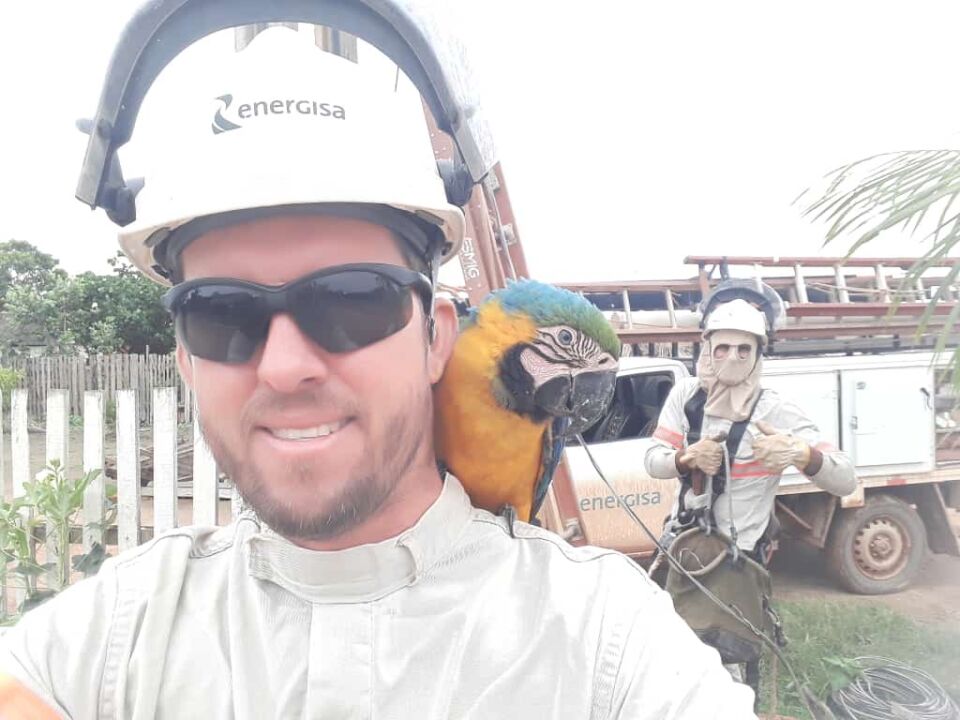 Uma arara-canindé protagonizou uma cena inusitada no distrito de Guariba, em Colniza, município do noroeste de Mato Grosso, a mais de mil quilômetros de Cuiabá, e que já faz parte da área amazônica: ao ver uma equipe de eletricistas da Energisa, resolveu conferir de perto o trabalho deles e acabou num “chamego” só.