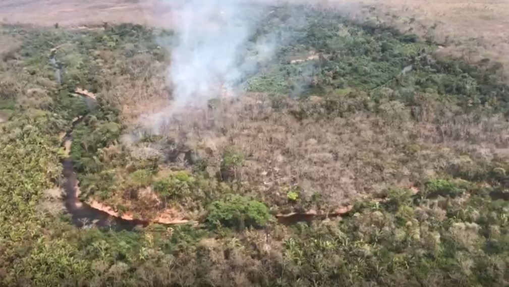 No local se encontram duas guarnições do CBMMT e um esquadrão do ICMBio, realizando monitoramento e verificando possíveis riscos e melhores pontos para extinção do incêndio, cuja linha de fogo caminha em direção a um rio.