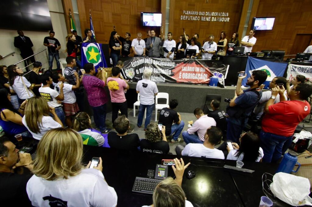 A mobilização dos servidores para acompanhar a votação das matérias previstas na pauta da sessão noturna dessa terça-feira (22) começou já no início da manhã. Diversas categorias lotaram o saguão, os auditórios e o plenário do Legislativo. Elas pediam a retirada imediata da pauta de votação os projetos da RGA, da criação da Lei de Responsabilidade Fiscal do Estado e da proposta referente ao conselho do MT Prev.