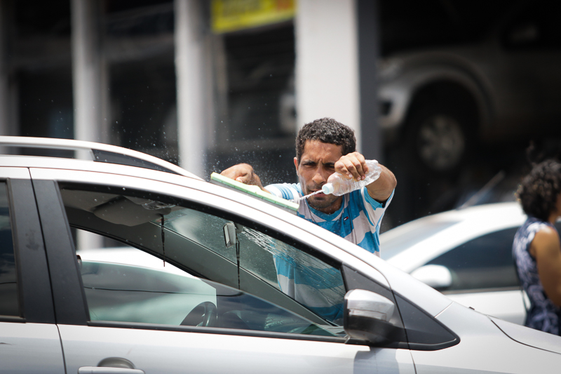 Cleomar Rodrigues da Costa, 27, está há 2 anos jogando água com detergente no para-brisa das pessoas e limpando com um pequeno rodo.