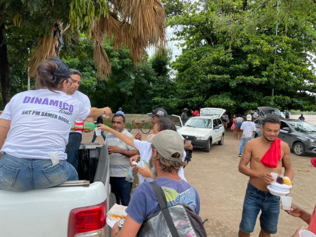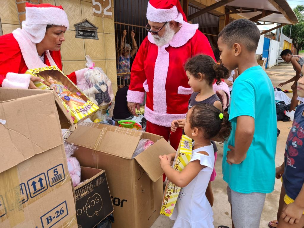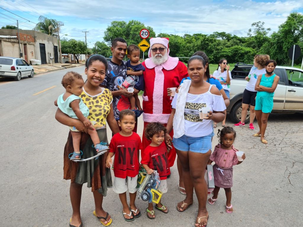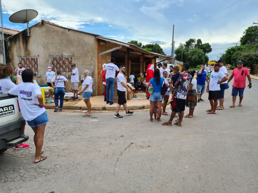 Às 9 horas, eles chegaram ao Bairro Parque Geórgia, em Cuiabá, com presentes, roupas e cachorro-quente para entregar às famílias carentes do Bairro Parque Geórgia.