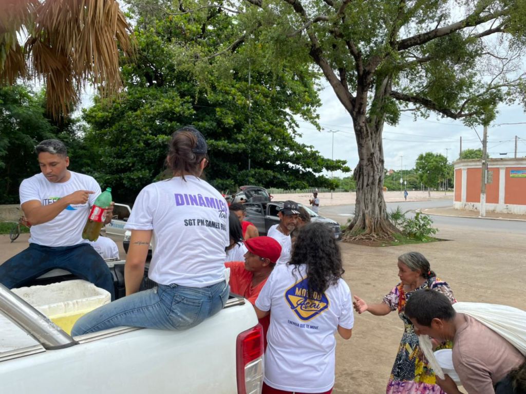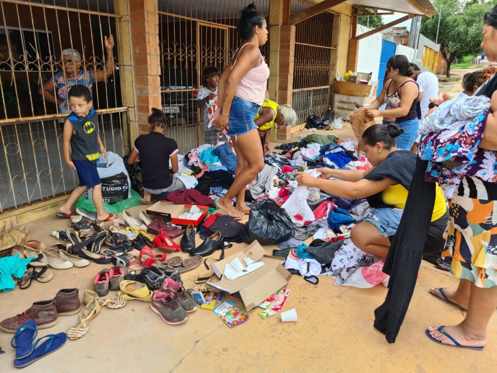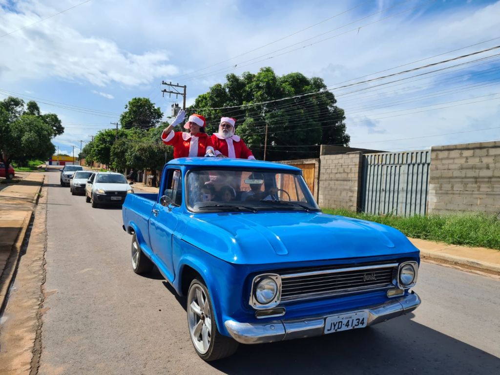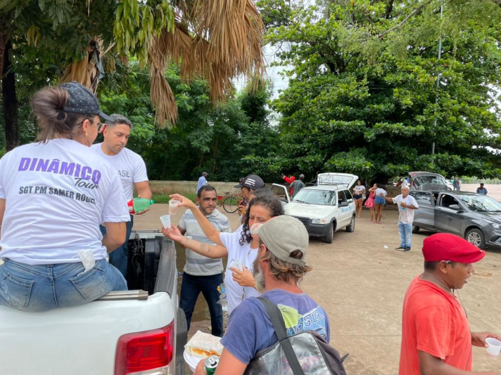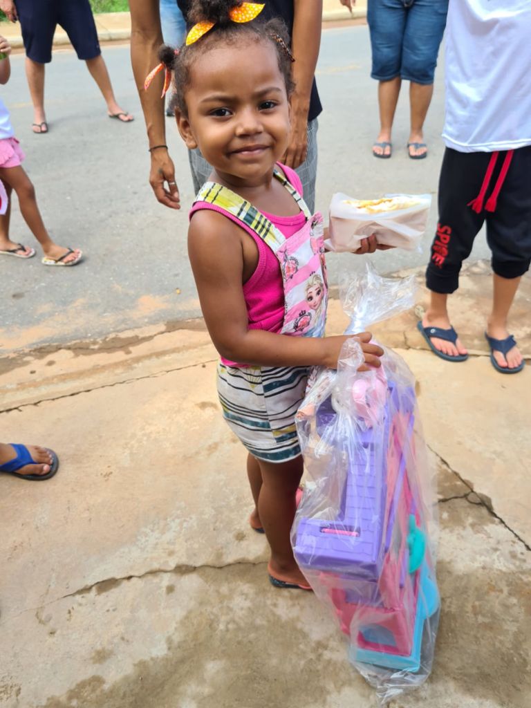 Às 9 horas, eles chegaram ao Bairro Parque Geórgia, em Cuiabá, com presentes, roupas e cachorro-quente para entregar às famílias carentes do Bairro Parque Geórgia.