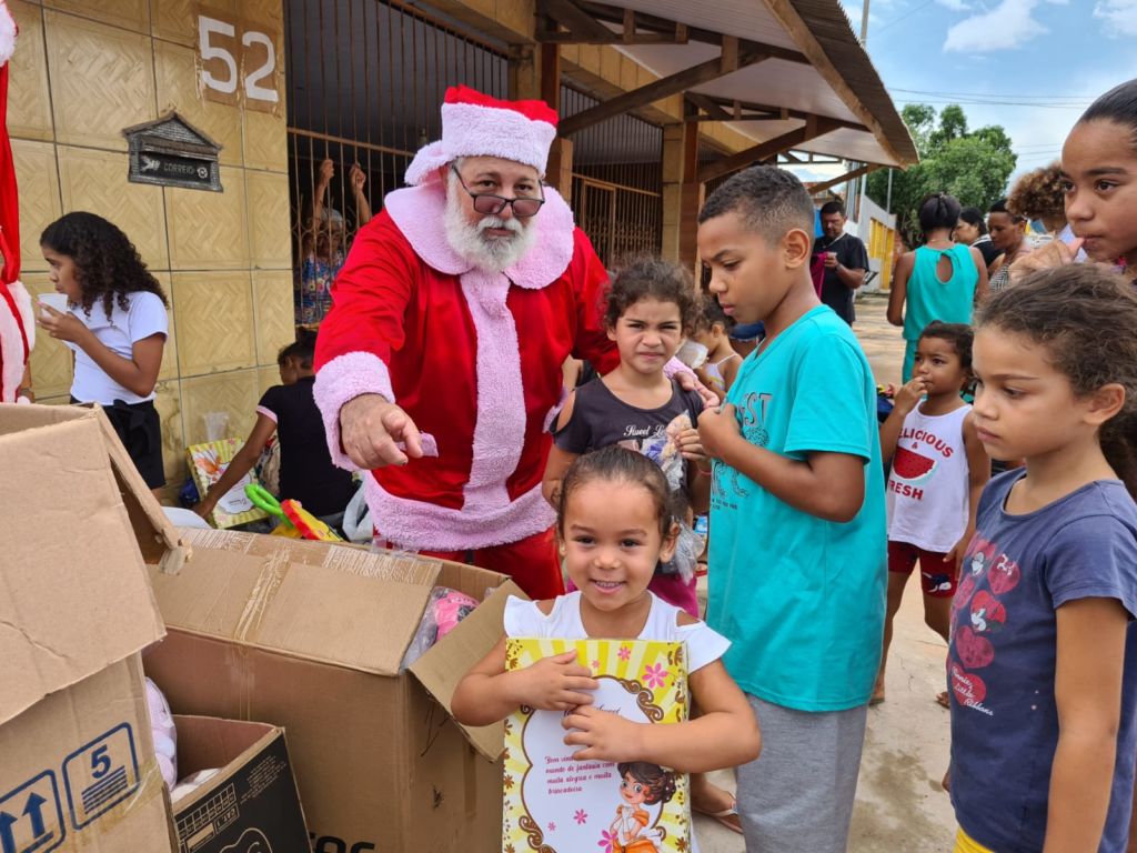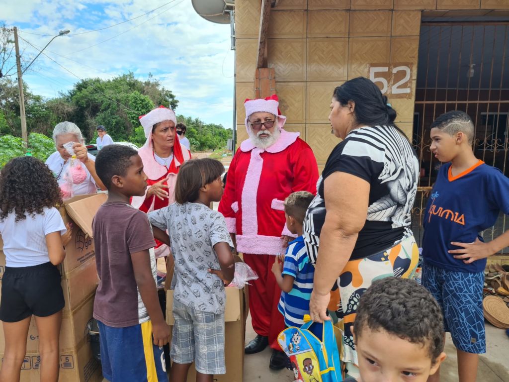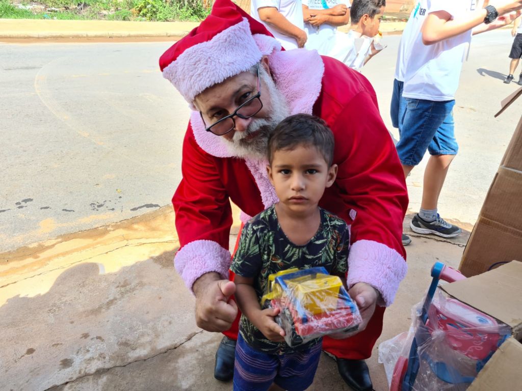 Papai Noel entrega presentes e cachorro-quente a famílias e moradores de rua de Cuiabá