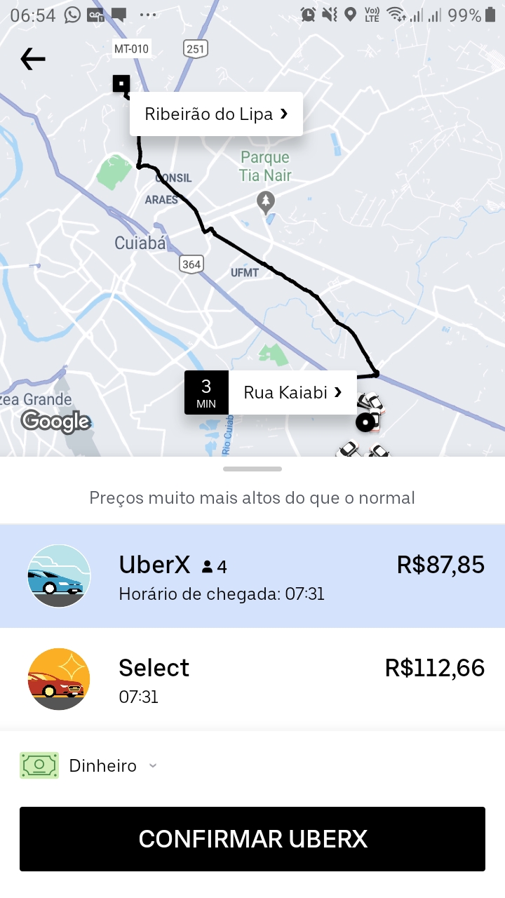 Sem ônibus na manhã desta segunda-feira (10), parte da população de Cuiabá, Várzea Grande e distritos da Guia e Livramento recorreu aos aplicativos de transporte privado, como Uber e 99. O resultado foi que a demanda subiu de tal maneira, que a chamada “taxa dinâmica” passou a ser aplicada e o preço das corridas ficou bem mais elevado do que o comum.