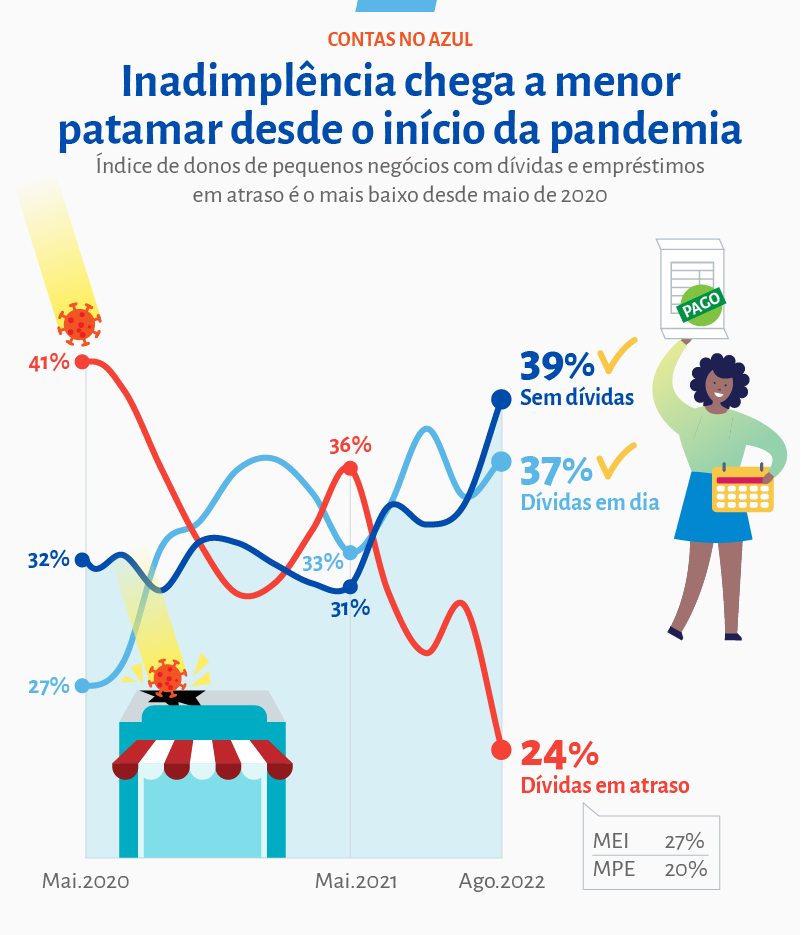 Os dados são da Pesquisa Pulso dos Pequenos Negócios, realizada entre os dias 26 de agosto e 11 de setembro deste ano, por meio de formulário online com a participação de todos os 26 estados brasileiros e o DF. Desde março de 2020, início da pandemia da Covid-19, o Sebrae acompanha os impactos da crise sobre os pequenos negócios. Há um ano, o índice de inadimplência encontrava-se em 31%.