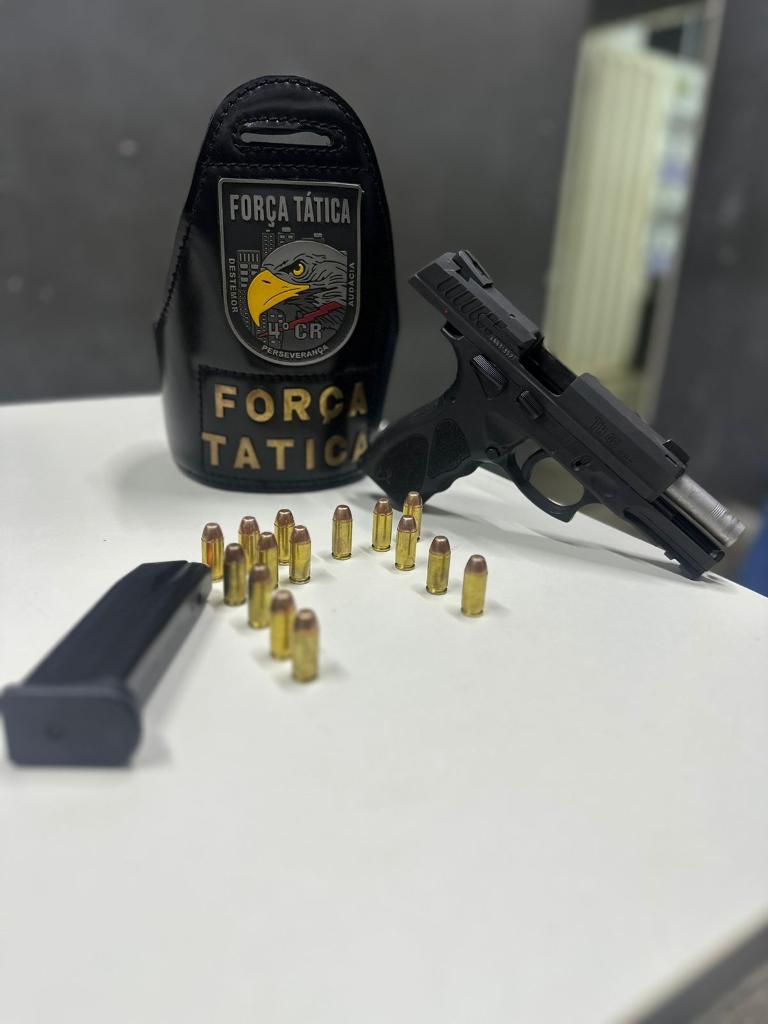 Ainda durante a noite, um homem foi conduzido por ameaça e violência doméstica contra uma mulher, no bairro Novo Horizonte. Os militares foram acionados e entraram em contato com a vítima, que informou que o seu ex-namorado estava muito exaltado e com uma arma de fogo. Uma pistola de calibre .40 carregada com 15 munições também foi apreendida.