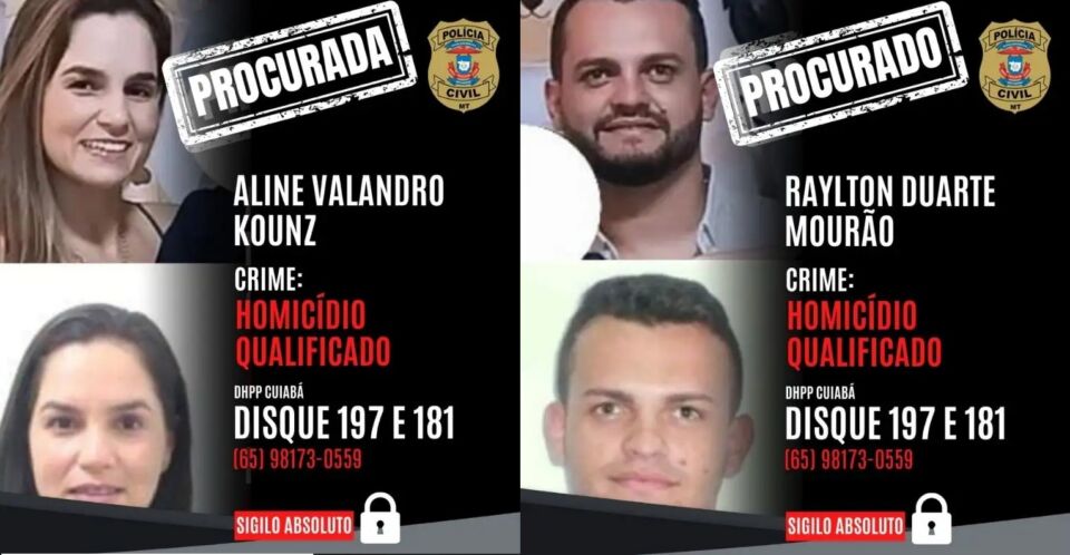 A Polícia Civil colocou nas ruas, nesta quinta-feira (17), cartazes de “procurados” com as fotos do policial militar Raylton Duarte Mourão e da esposa, a farmacêutica Aline Valandro Kounz. O casal é apontado como suspeito de envolvimento no assassinato da personal trainer Rozeli da Costa Sousa Nunes, de 38 anos, morta a tiros em Várzea Grande no último dia 11.