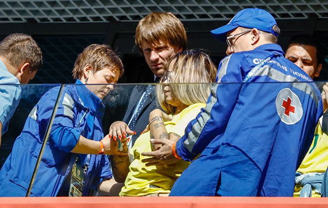 Segundo informações da agência internacional Grosby Group, a jovem se sentiu mal e os paramédicos que estavam no estádio em São Petersburgo foram socorrê-la. Nas imagens é possível ver ela sendo amparada pelos profissionais. Ao lado, a namorada do craque a atriz Bruna Marquezine confere o atendimento.