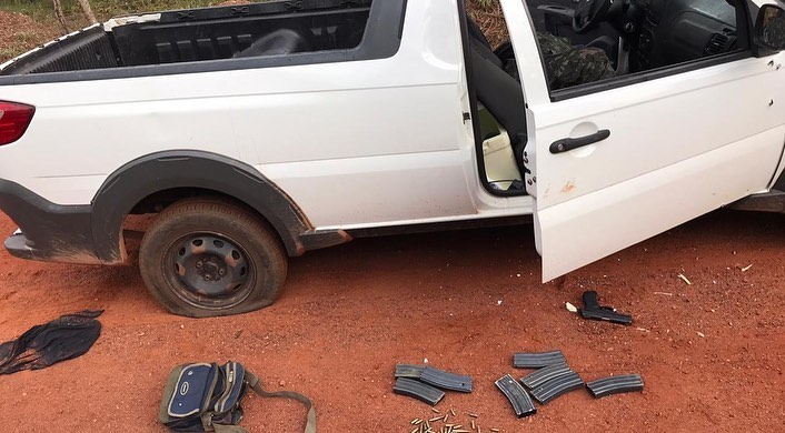 Ao redor dele foram encontrados diversos carregadores municiados com munições de 556 e espoletas com estopins utilizadas para explosões de emulsões.