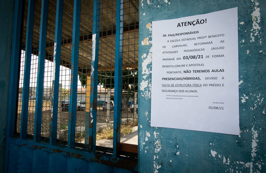 As salas de aula continuam vazias, apenas alguns professores ocupam seus postos para acompanhar os alunos virtualmente. O cenário da pandemia se mantém porque as escolas não têm condições de receber os estudantes.