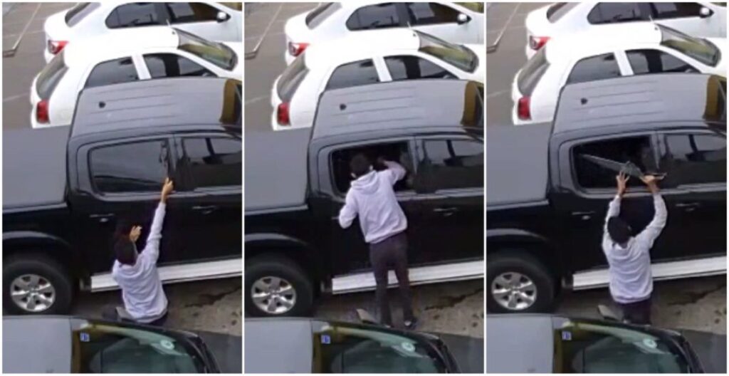 As imagens mostram o criminoso caminhando tranquilamente ao redor de uma caminhonete estacionada, modelo Hilux. Ele inspeciona o que tem dentro do veículo e, em segundos, com pequenas e certeiras “marteladas” com um objeto pontiagudo, consegue quebrar quase que por inteiro o vidro traseiro do veículo.