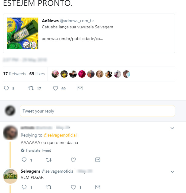 Conhecida por sua atuação nas redes sociais, a marca de bebidas alcoólicas Catuaba Selvagem divulgou nessa terça-feira (29/5), sua mais nova ação promocional para a Copa do Mundo 2018: agora as garrafas da marca após o consumo poderão ser transformadas em verdadeiras vuvuzelas, cornetas que se tornaram um sucesso durante a Copa de 2010, realizada na África do Sul. A ideia da marca é utilizar essa energia novamente para torcer pela seleção brasileira de futebol que disputa o título em terras russas.