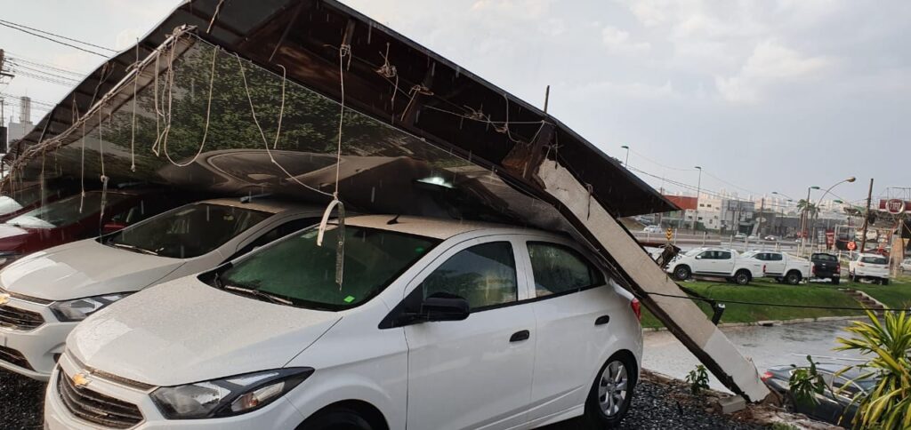 Na Avenida da FEB, uma das principais vias de Várzea Grande, o telhado de duas concessionárias de veículos cedeu com os fortes ventos e caiu sobre os carros.