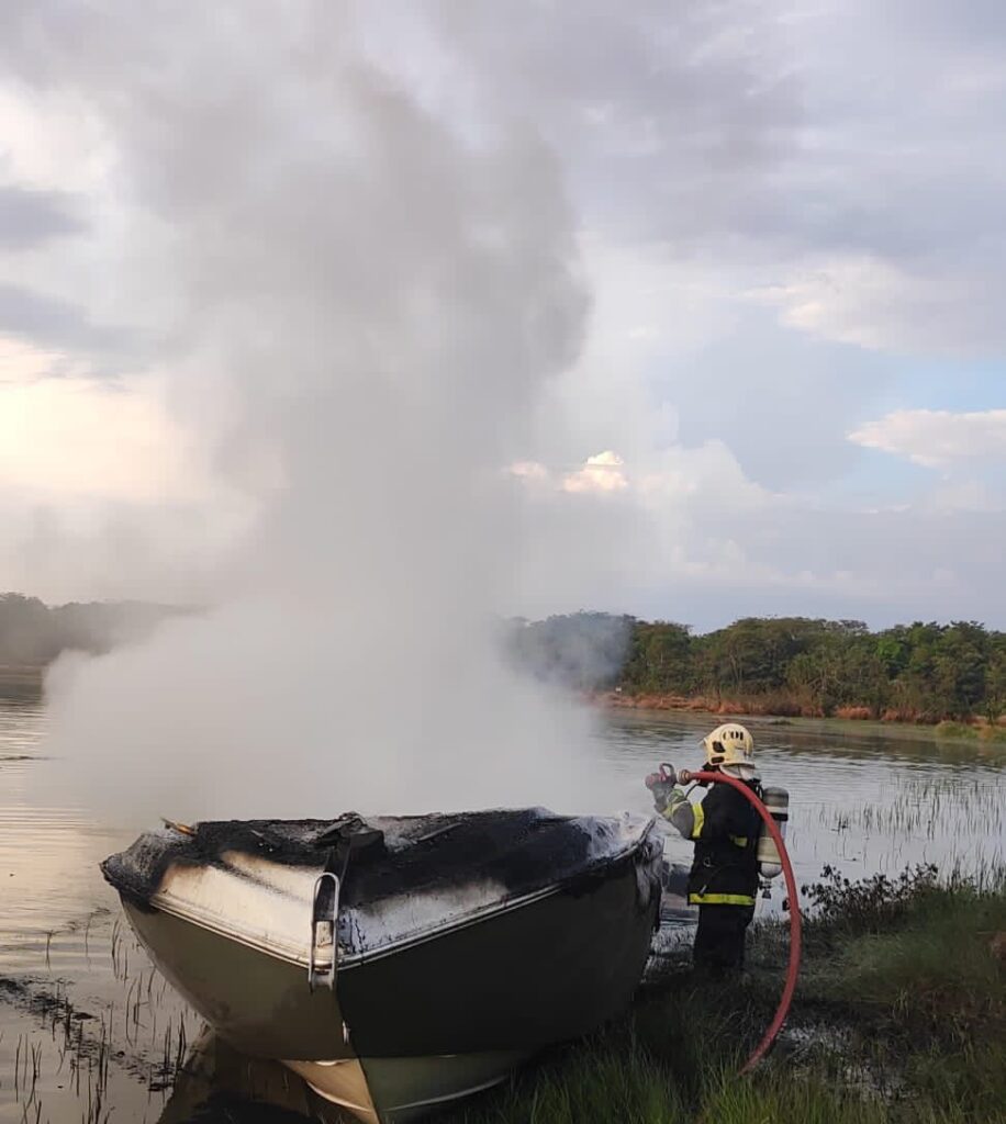 Os bombeiros combateram as chamas e fizeram o rescaldo da lancha. Em seguida, iniciaram as buscas por uma vítima que foi arremessada na água.