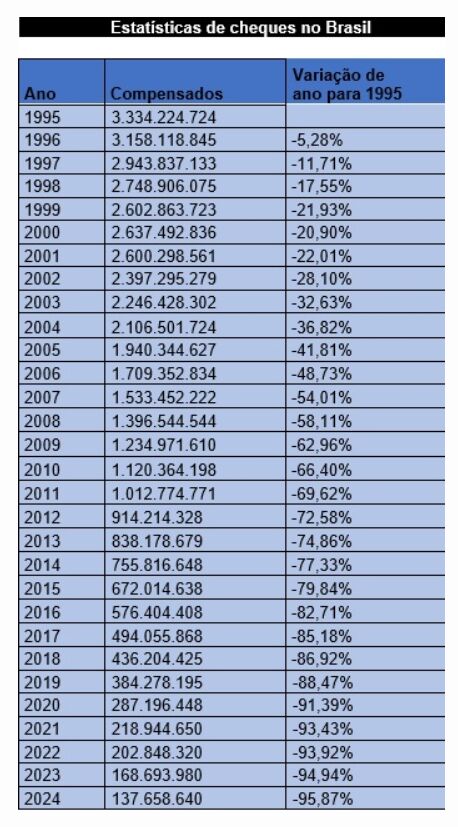Na comparação com 1995, início da série histórica, quando foram compensados 3,3 bilhões de cheques, a queda foi significativa, de 95,87%.