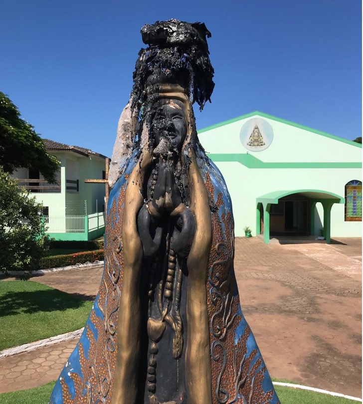 Vândalos destruíram uma imagem de Nossa Senhora Aparecida na madrugada desta segunda-feira (17), em frente a uma igreja localizada na Avenida Santos Dumont, no município de Santa Carmem (510 km de Cuiabá).