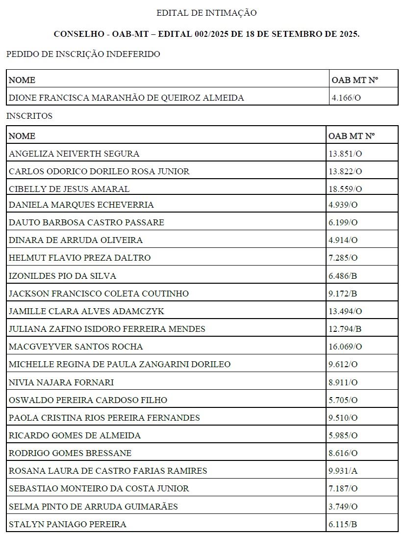A Ordem dos Advogados do Brasil – Seccional Mato Grosso (OAB-MT) publicou o edital de intimação com os nomes dos profissionais que se inscreveram para concorrer à vaga de desembargador pelo Quinto Constitucional, destinada à classe dos advogados no Tribunal de Justiça de Mato Grosso (TJMT).