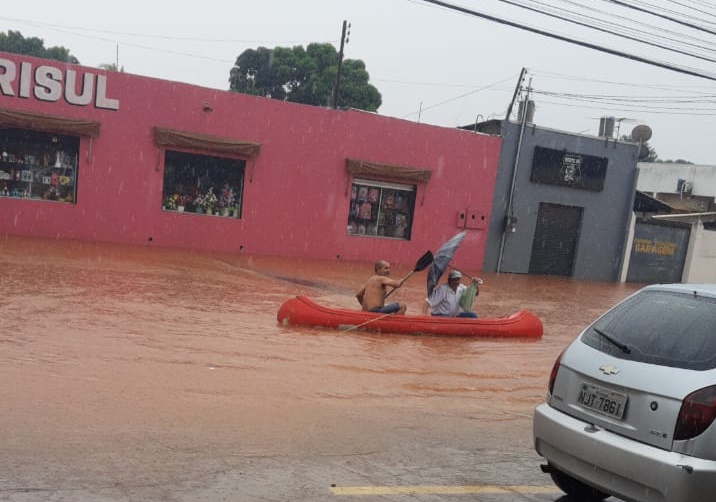 A pancada de chuva que atingiu Cuiabá no início da tarde deste sábado (29) foi suficiente para alagar o Bairro Jardim Industriário.