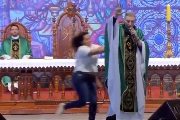 O Padre Marcelo fazia o sermão, quando a mulher furou a segurança do local, entrou correndo no altar e empurrou o sacerdote, que caiu de cima da estrutura.