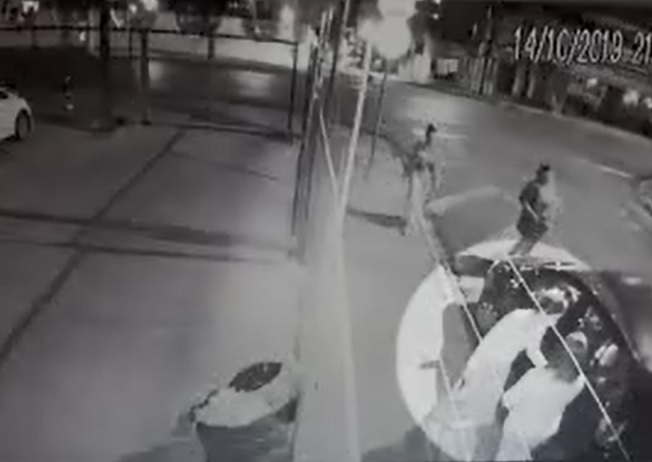 Enquanto a motorista do carro atravessa a avenida e segue em direção ao carro, um trio de mulheres passa pelo veículo. A vítima destrava o carro, abre a porta do passageiro e coloca sua bolsa. Depois, dá a volta para entrar no carro.