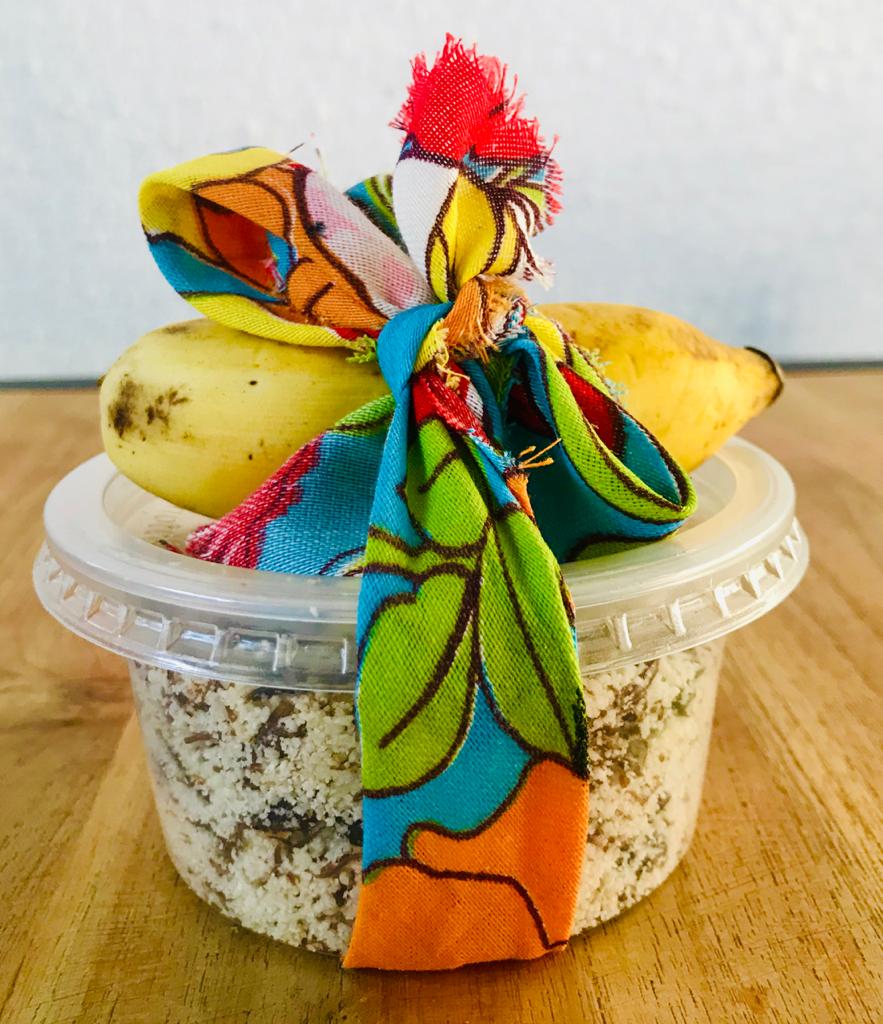 O “Box Anarriê” vem com paçoca de pilão com bananinha, pé de moleque, cocada, bolinho de pamonha, maçã do amor, milho cozido amanteigado, arroz doce, Maria Isabel e feijão com calabresa.
