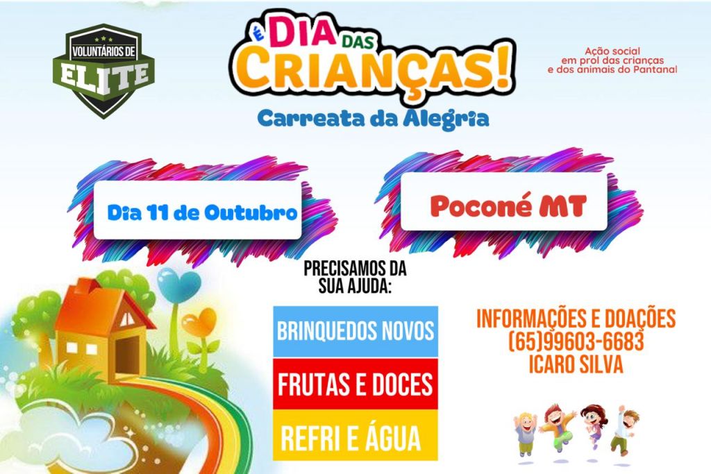 A ideia é fazer uma carreata por comunidades ribeirinhas do Pantanal no dia 11 de outubro, passando por Porto Cercado e Poconé, entregando almoço às famílias e, em comemoração ao Dia das Crianças, kits de doces, brinquedos e kits escolares com revistas de atividades, lápis de escrever e lápis de cor.